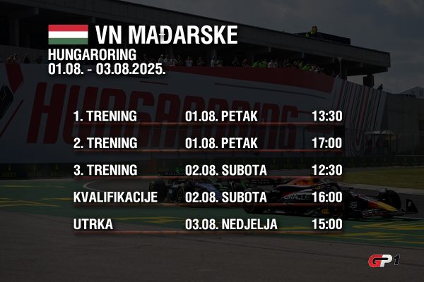 Poslije sprint vikenda u Belgiji, na Hungaroringu nas očekuje standardni raspored s tri slobodna treninga. Prvi je u petak u 13:30, drugi u petak u 17:00, a treći u subotu u 12:30. Kvalifikacije počinju u 16 sati u subotu, dok je start utrke u nedjelju u 15 sati.