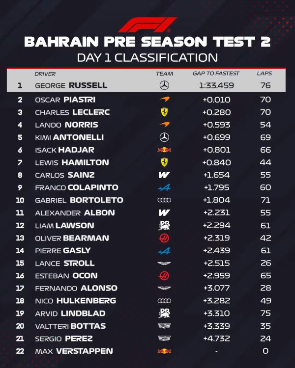 Što se odrađene kilometraže tiče, prednjačio je – opet Russell. On je skupio 76 krugova, a budući da je Kimi Antonelli u svojoj sesiji odradio 69, Mercedes je dan završio s lijepih 145 krugova na stazi Bahrain International. Racing Bullsi su odvozili 136, McLaren 124, a Audi 120 krugova.