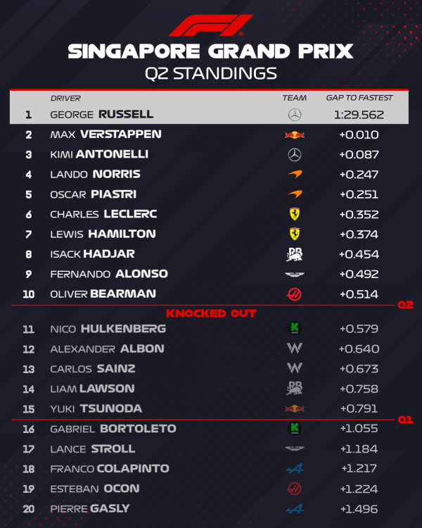 Mercedesov George Russell iznenadio je i osvojio pole position za utrku Velike nagrade Singapura. Englez je postavio vrijeme od 1:29,165 iz prvog pokušaja u Q3, a nitko nije uspio skinuti to vrijeme na kraju sesije. Drugi je završio Max Verstappen, a treći je Oscar Piastri.