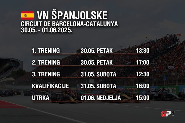 Vremenskih neprilika u Barceloni ne bi trebalo biti. Šanse za kišu su minimalne, a očekuje se sunčan i vrlo topao vikend s najvišim dnevnim temperaturama iznad 30 Celzijevih stupnjeva. Satnica je ista već treći vikend zaredom, sa subotnjim kvalifikacijama u 16 sati te startnom nedjeljne utrke u 15 sati.